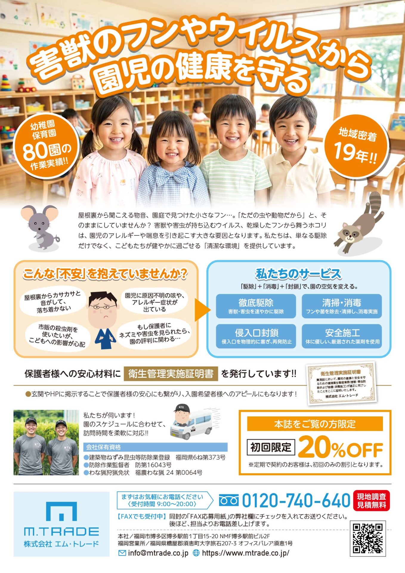 新サービス 幼稚園・保育園の害獣・害虫駆除2026年2月16日 屋根裏から聞こえる物音、園庭で見つけた小さなフン…。 「ただの虫や動物だから」と、そのままにしていませんか? 害獣や害虫が持ち込むウイルス、乾燥したフンから舞うホコリは、 園児のアレルギーや喘息を引き起こす大きな要因となります。 私たちは、単なる駆除だけでなく、こどもたちが健やかに過ごせる「清潔な環境」を提供しています。 詳しくはこちら 【飲食店経営者向け】もう悩まない!プロが教える効果的...